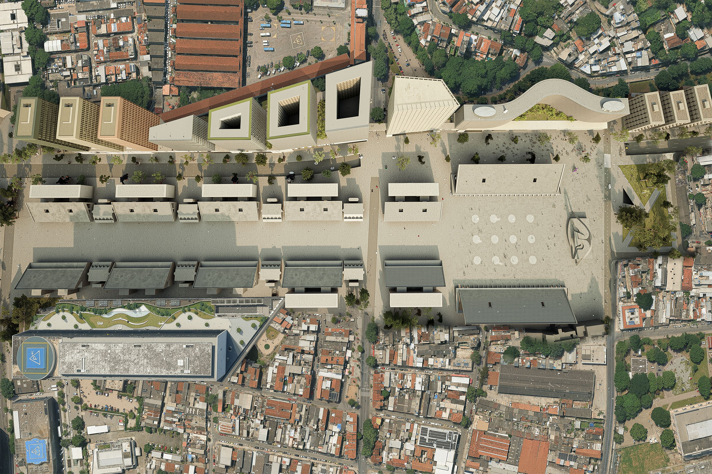 A saída do Elevado garante espaço suficiente para equacionar todos os problemas do Sambódromo – interno e externo – e construir uma nova área residencial na cidade (4.000 unidades de 50m2 em média), com praças, parques e equipamentos de lazer e cultura, em áreas que antes eram ocupadas por vias. Com essa proposta, abrimos mais uma vertente de desenvolvimento urbano na área central da cidade, diretamente conectado com a Zona Sul, área portuária e ao novo empreendimento no terreno da Estação Barão de Mauá (de nossa autoria), interligados pelo Parque Linear “Caminho das Lanternas".
