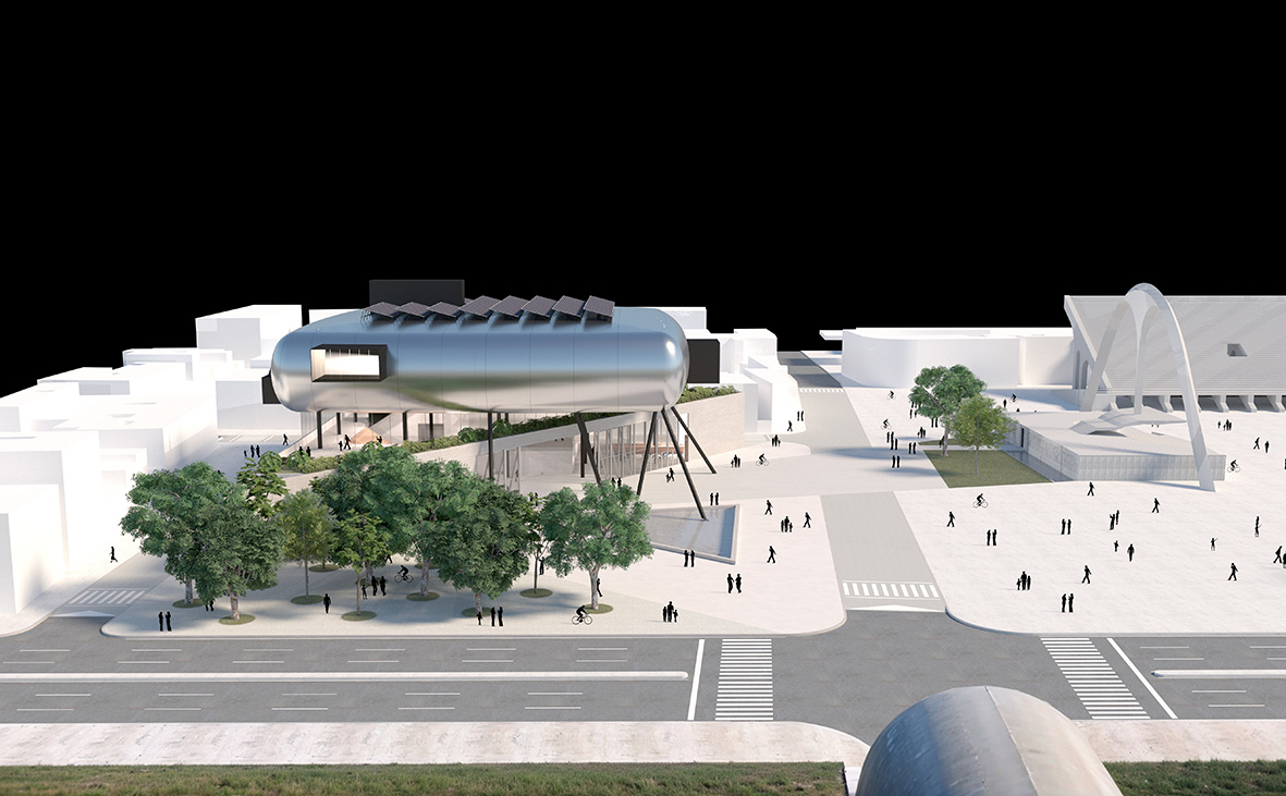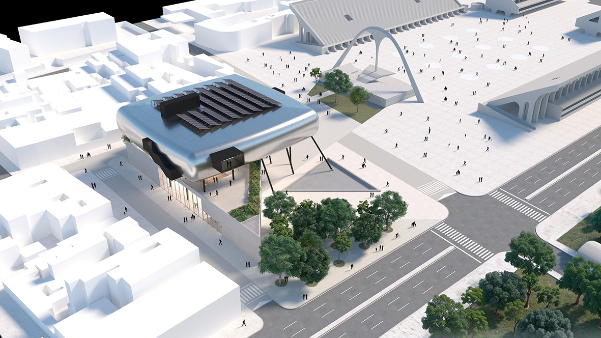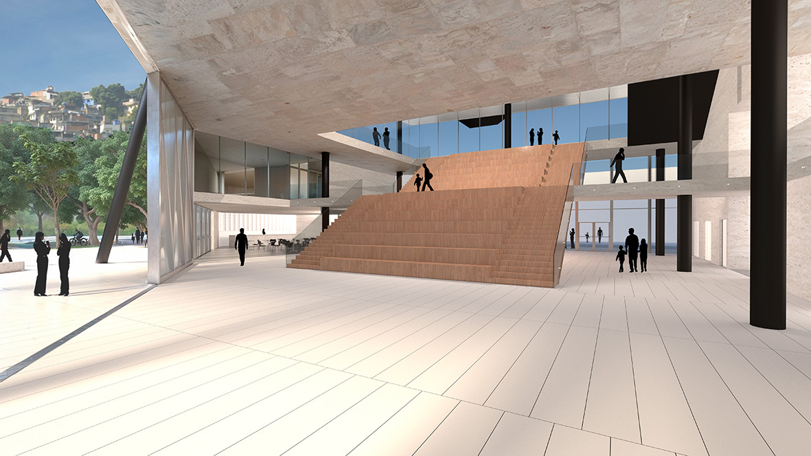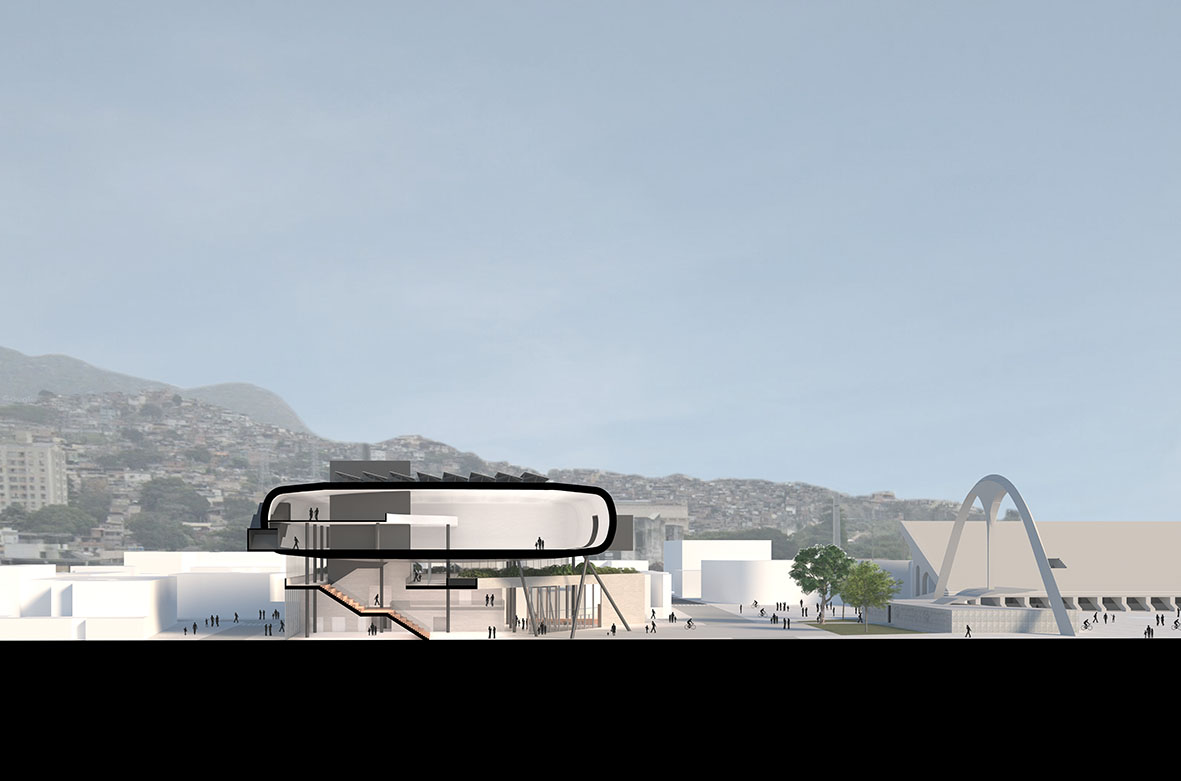 1. A construção de um embasamento, na escala do casario do entorno, conformando uma praça voltada para o Sambódromo, para receber, em dias de carnaval, a dispersão da multidão. E, no restante do ano, torna-se um espaço de encontro, permanência e eventos ligados ao Museu. Em seu interior, estão os usos de caráter público, como auditório, estúdio de música, sala multiuso (exposições, cursos, palestras), restaurante, cafeteria, loja, bilheteria e chapelaria. Uma grande escadaria-arquibancada faz a conexão entre todos os níveis e espaços, podendo também ser utilizada como superfície de exposição ou permanência para assistir eventos que ocorram no foyer e na praça;