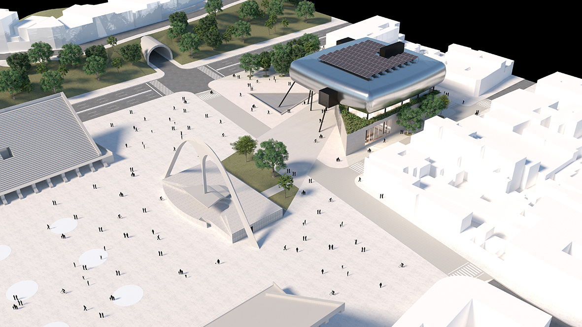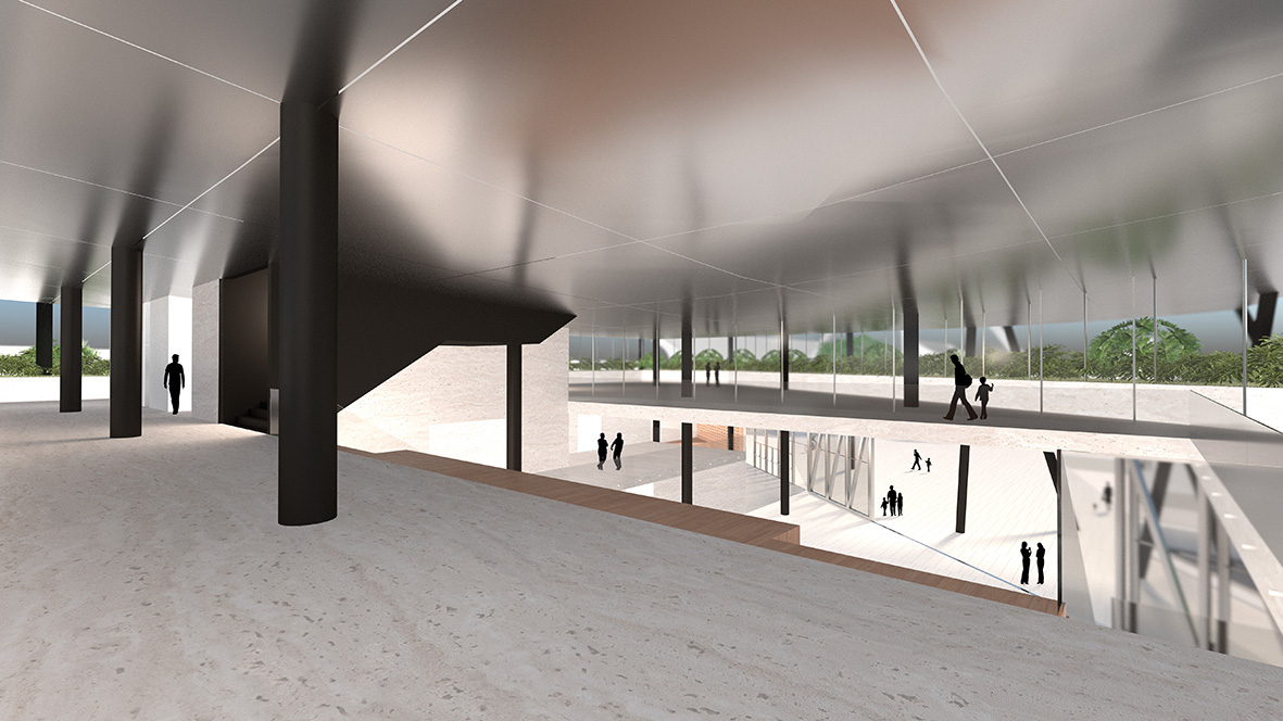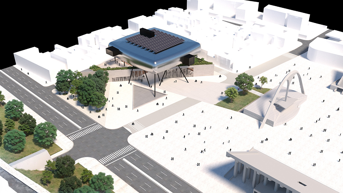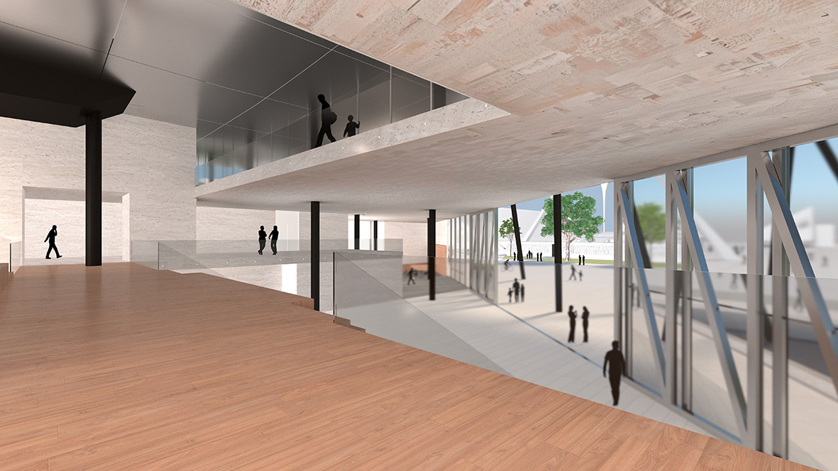 1. A construção de um embasamento, na escala do casario do entorno, conformando uma praça voltada para o Sambódromo, para receber, em dias de carnaval, a dispersão da multidão. E, no restante do ano, torna-se um espaço de encontro, permanência e eventos ligados ao Museu. Em seu interior, estão os usos de caráter público, como auditório, estúdio de música, sala multiuso (exposições, cursos, palestras), restaurante, cafeteria, loja, bilheteria e chapelaria. Uma grande escadaria-arquibancada faz a conexão entre todos os níveis e espaços, podendo também ser utilizada como superfície de exposição ou permanência para assistir eventos que ocorram no foyer e na praça;