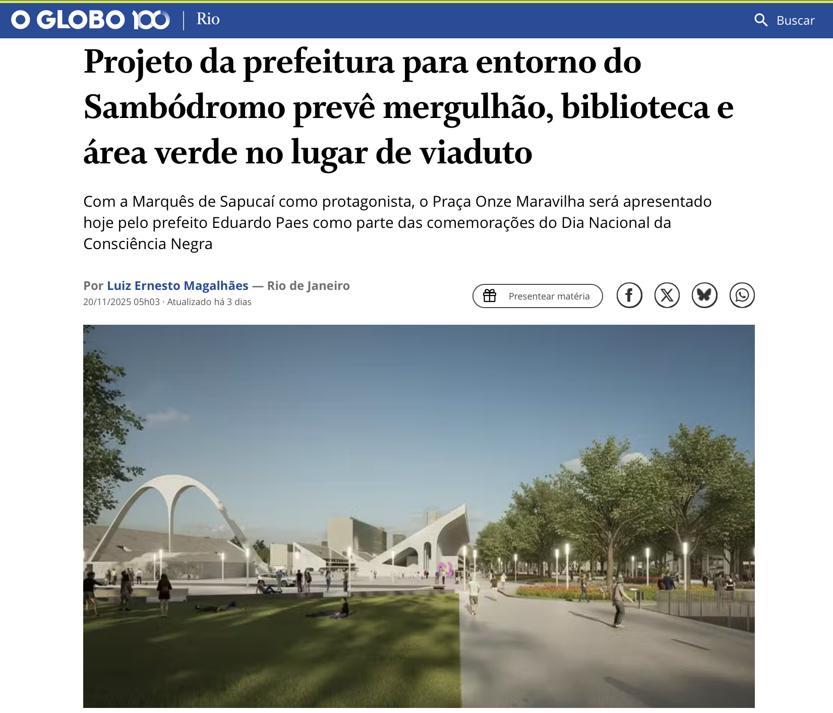 Reportagem publicada no jornal O Globo, no dia 20/11/2025, dia da Consciência Negra, sobre nosso projeto para o entorno do Sambódromo.